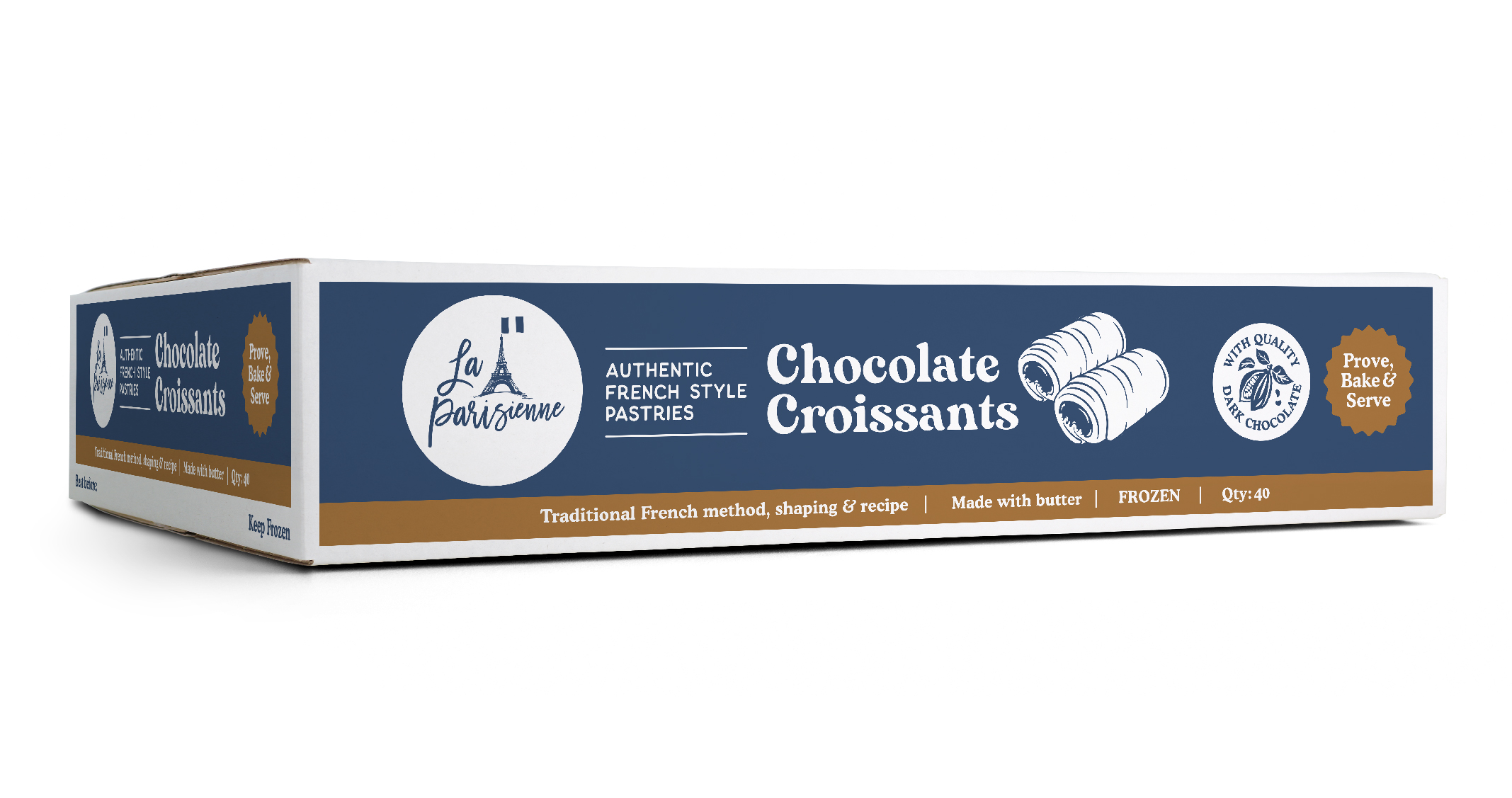 Frozen Chocolate croissants made for the chocolate lovers. Rolled and filled with rich quality dark chocolate. Made with protein rich flour, layered with high grade unsalted butter to ensure a light and flaky texture with a golden pastry. Croissants need to be proved prior to baking. Carton contains 40 chocolate croissants.