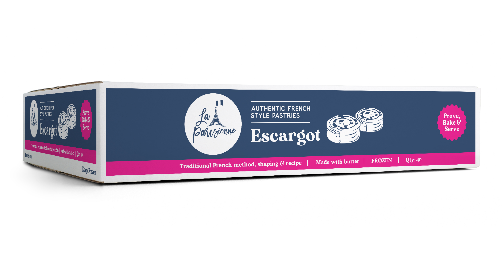 Frozen sweet dough swirled with custard and sultanas. Made with high grade unsalted butter to ensure a light and flaky texture with a golden pastry. Escargots need to be proved prior to baking. Finish off with a fruit glaze, fondant or icing sugar. Carton contains 40 escargot.